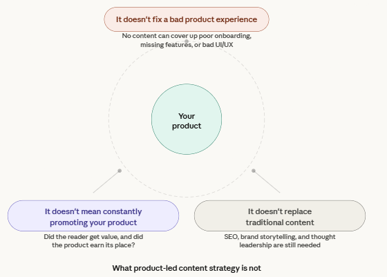 It doesn’t fix a bad product experience: If your product doesn’t solve real problems or has internal challenges like poor onboarding, missing features, or poor UI/UX, no amount of “great” content can cover it up. A product-led content strategy only shows the value that already exists in the product.