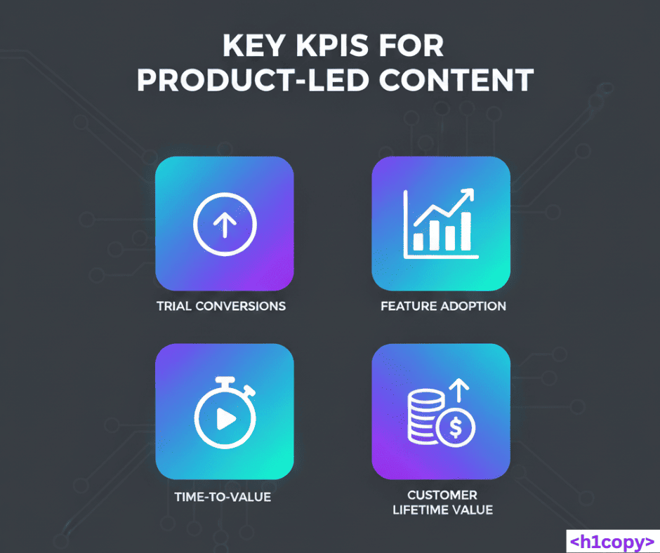 Track activation rates (trial signups), feature adoption, time-to-first-value, engagement on PLC assets, conversion from demo to paid, and user retention influenced by content touchpoints.