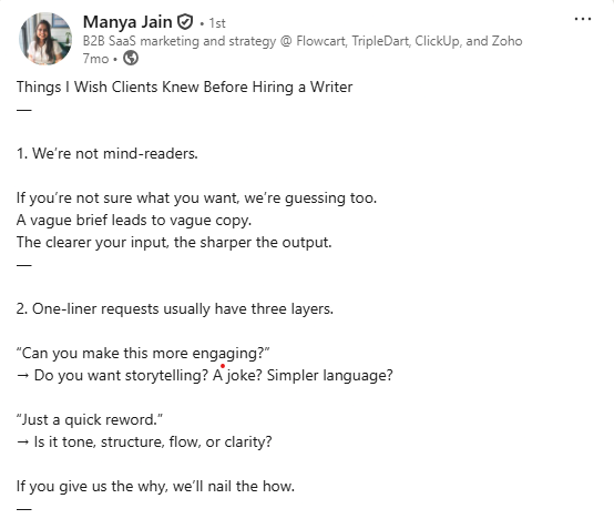 This is something Manya Jain, a B2B SaaS marketing strategist at ClickUp and TripleDart, addressed in the LinkedIn post above — a vague brief leads to vague copy, and the clearer your input, the sharper the output. It’s that simple, but most brands still get it wrong.