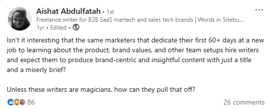 “Isn’t it interesting that the same marketers that dedicate their first 60+ days at a new job to learning about the product hire writers and expect them to produce brand-centric and insightful content with just a title and a miserly brief?”