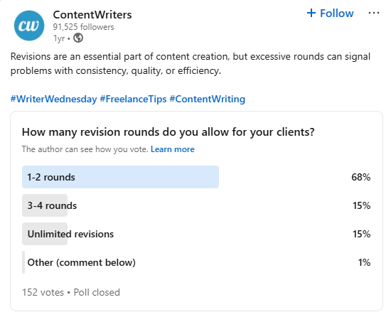 And the numbers back this up; according to a ContentWriters LinkedIn poll, 68% of freelance writers only allow 1-2 rounds of revisions.