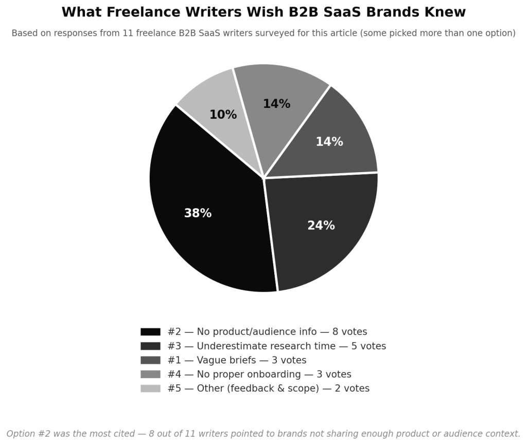 Out of 11 freelance B2B SaaS writers surveyed for this article, the pattern was impossible to ignore. 7 pointed to the same root cause — brands not sharing enough about their product or audience. According to Oluwaseun Akinlembola, a freelance SaaS content writer with experience working with several B2B SaaS brands,