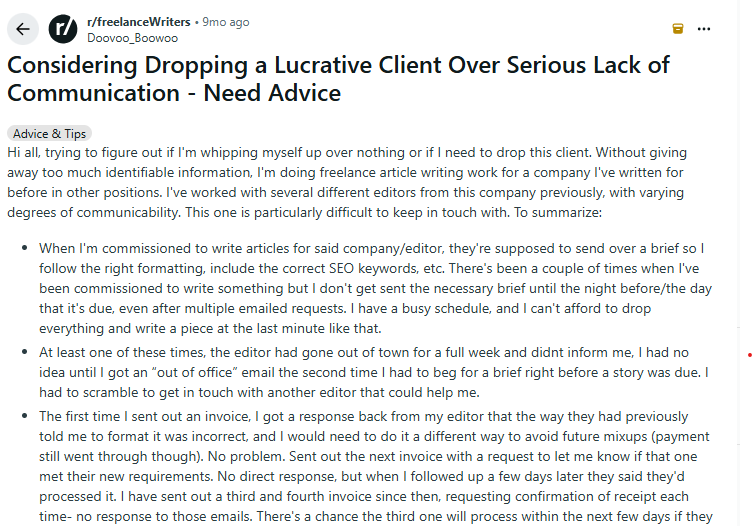 Invoices went unacknowledged. Days of complete radio silence followed every submission. They were considering dropping the client despite the pay being good. The comments section was full of writers who recognized the situation immediately.
