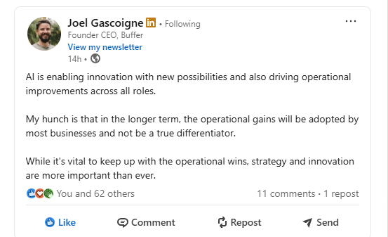 A great example is Buffer. The founder and team members post consistently on LinkedIn, sharing what they’re building, how they work, and the lessons they’re learning. They’re a fully remote team, yet they feel incredibly present and human to their audience. That consistency has built a level of trust that no ad campaign could replicate.
