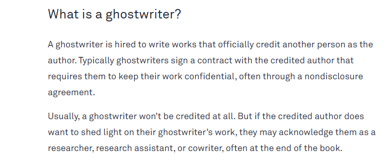 A ghostwriter is someone who writes content in your voice and tone, without taking any credit for it. As  Grammarly puts it, a ghostwriter is “hired to write works that officially credit another person as the author.”